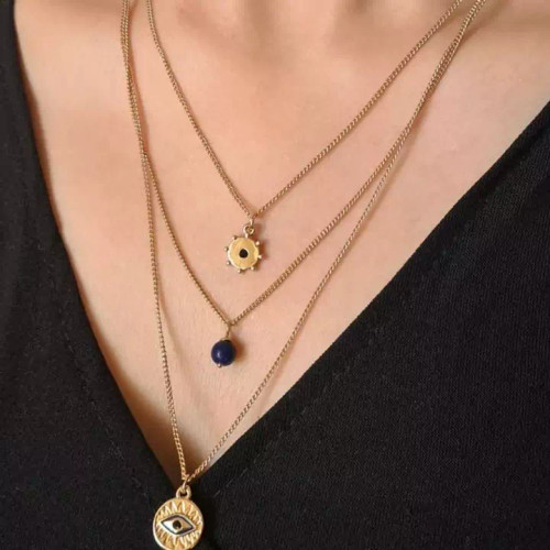 نیم ست گردنبند سه لاین چشم با سنگ طبیعی لاپیس (سنگ ضد استرس) گردنبند چشم گوشواره چشم