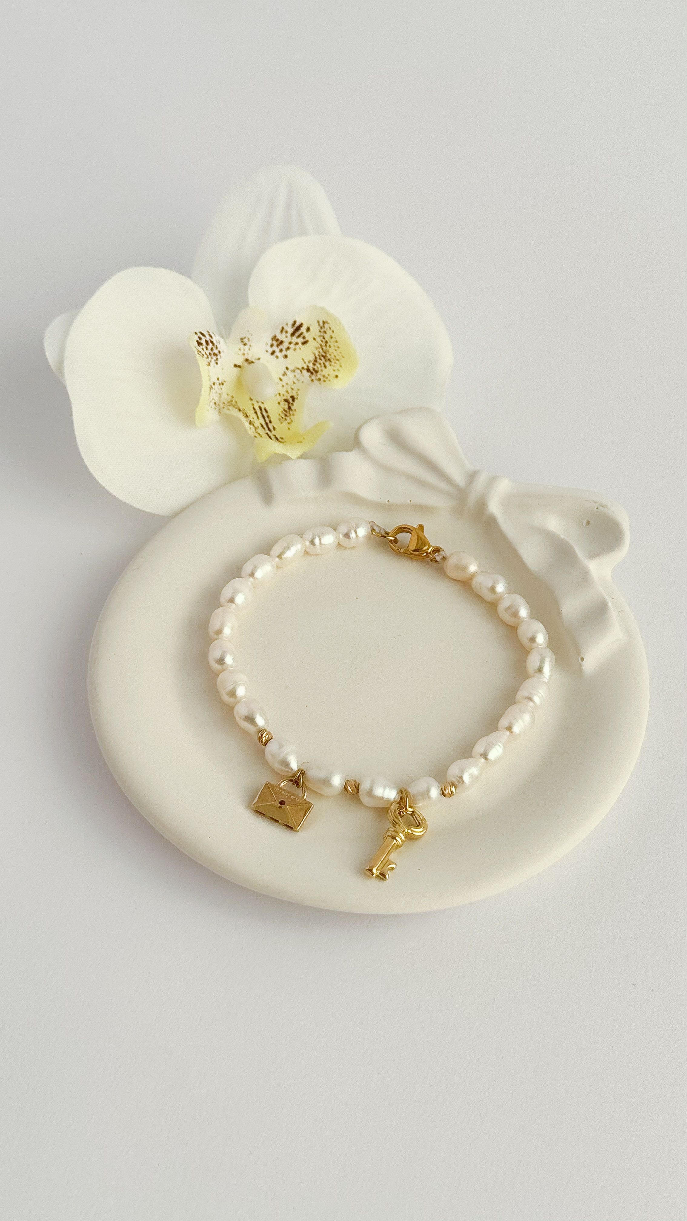 دستبند مروارید پرورشی با اویز دو پلاک طلا و گوی البرنادو ۱۸ عیار دستبند طلا دستبند زنانه