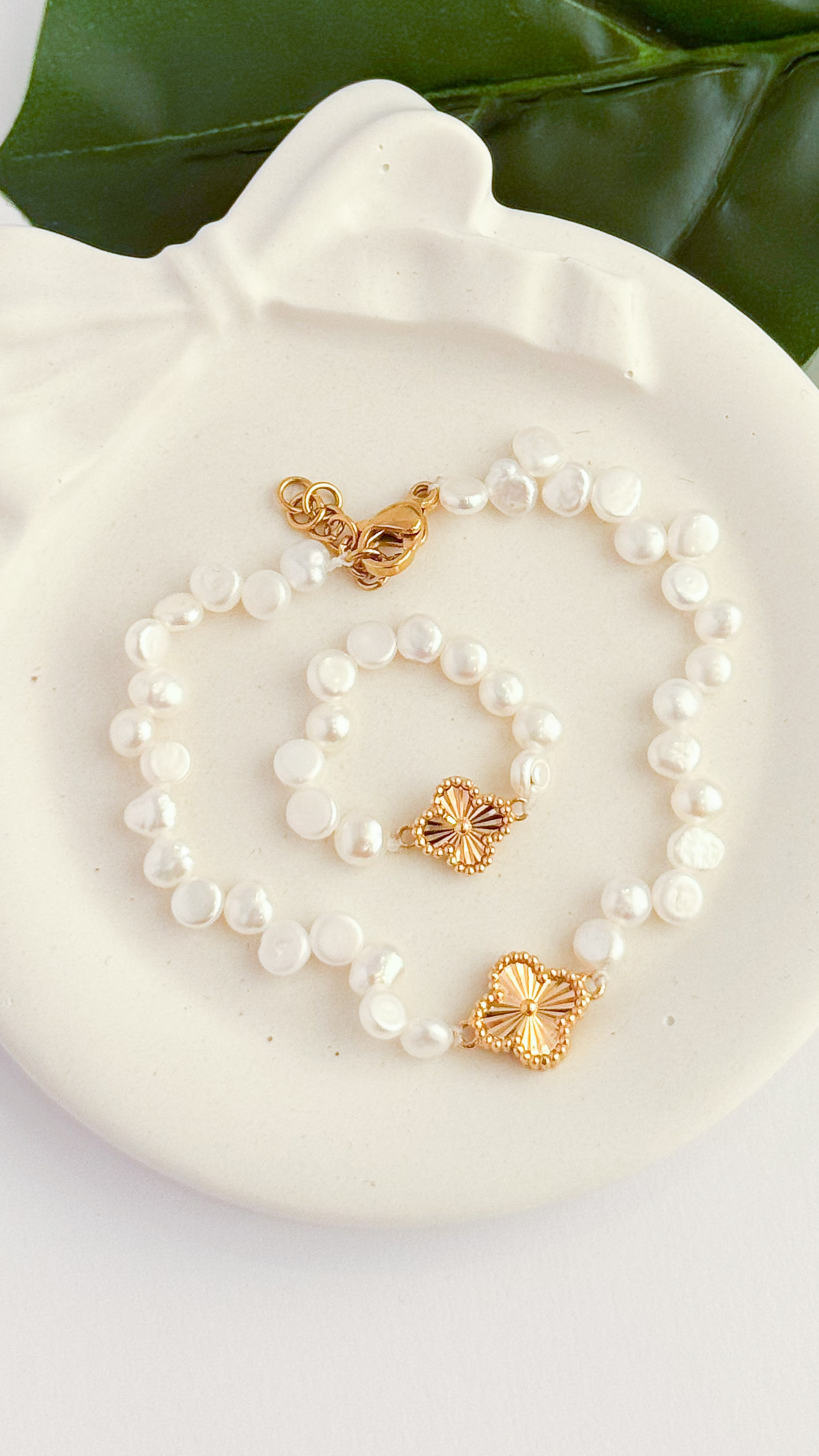 دستبند ونکلیف طلا ۱۸ عیار با مروارید shell دستبند مروارید دستبند طلا دستبند دخترانه
