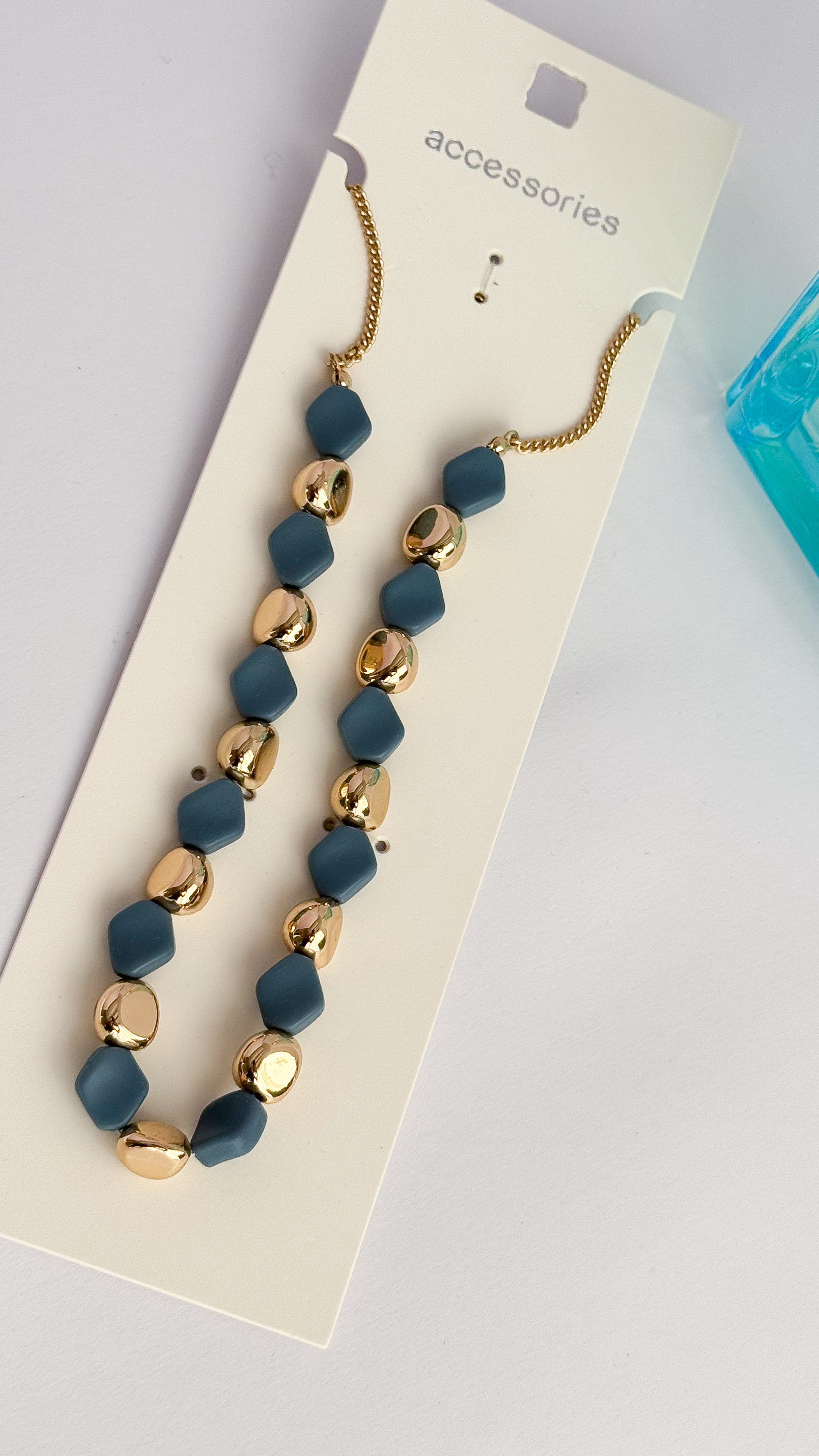 گردنبند مهره ابی درباری و طلایی با نما و خوشرنگ گردنبند ابی گردنبند دخترانه