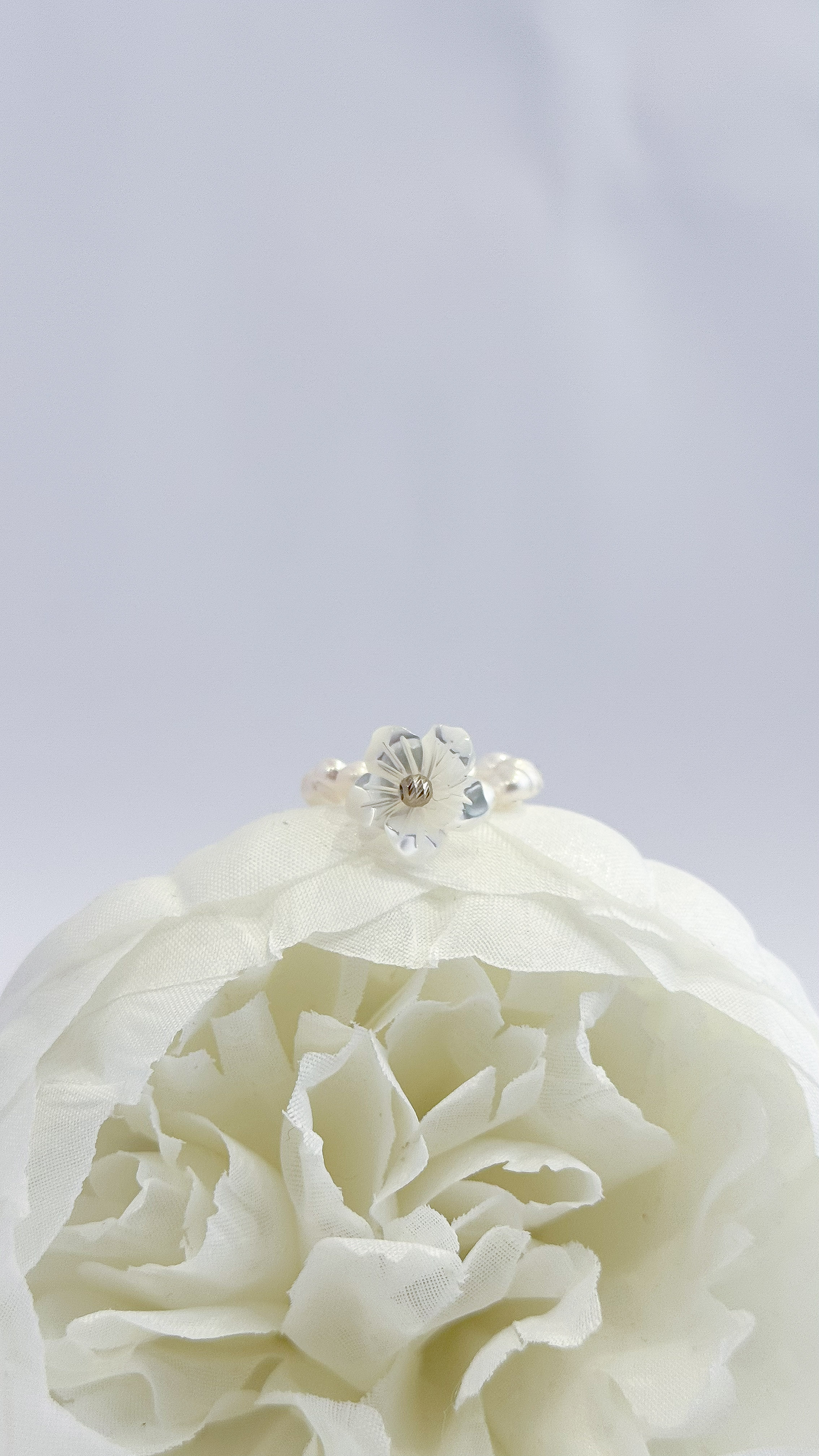 انگشتر گل صدف طبیعی با مروارید پرورشی و گوی البرنادو نقره ای طلا ۱۸ عیار انگشتر طلا