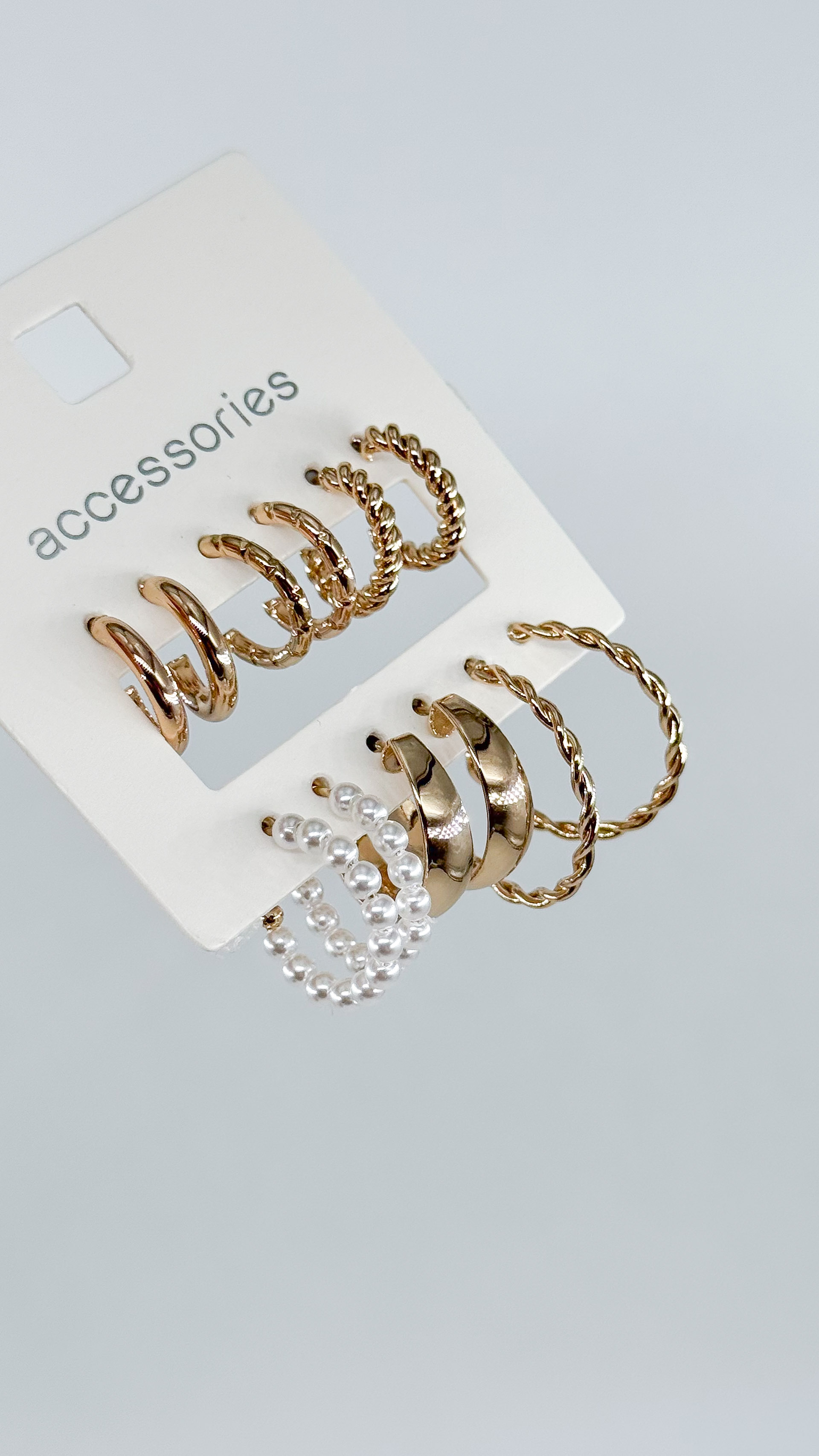 پک شش عددی گوشواره طلایی نیم حلقه مرواریدی پیچ ساده پک گوشواره طلایی