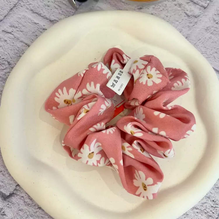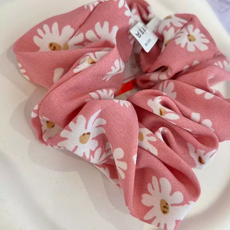 کش اسکرانچی وارداتی پارچه ای صورتی با گل های بابونه لطیف و سایز متوسط